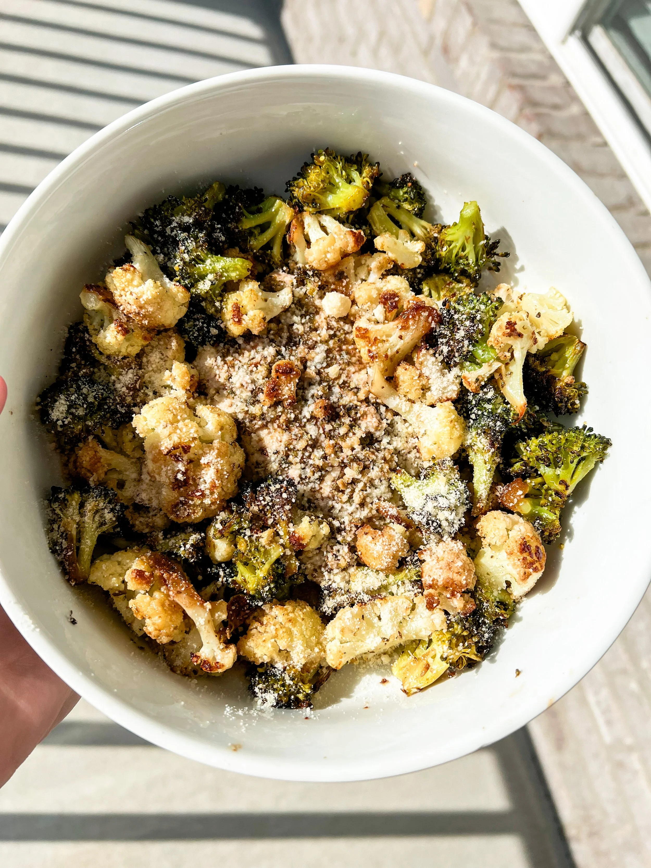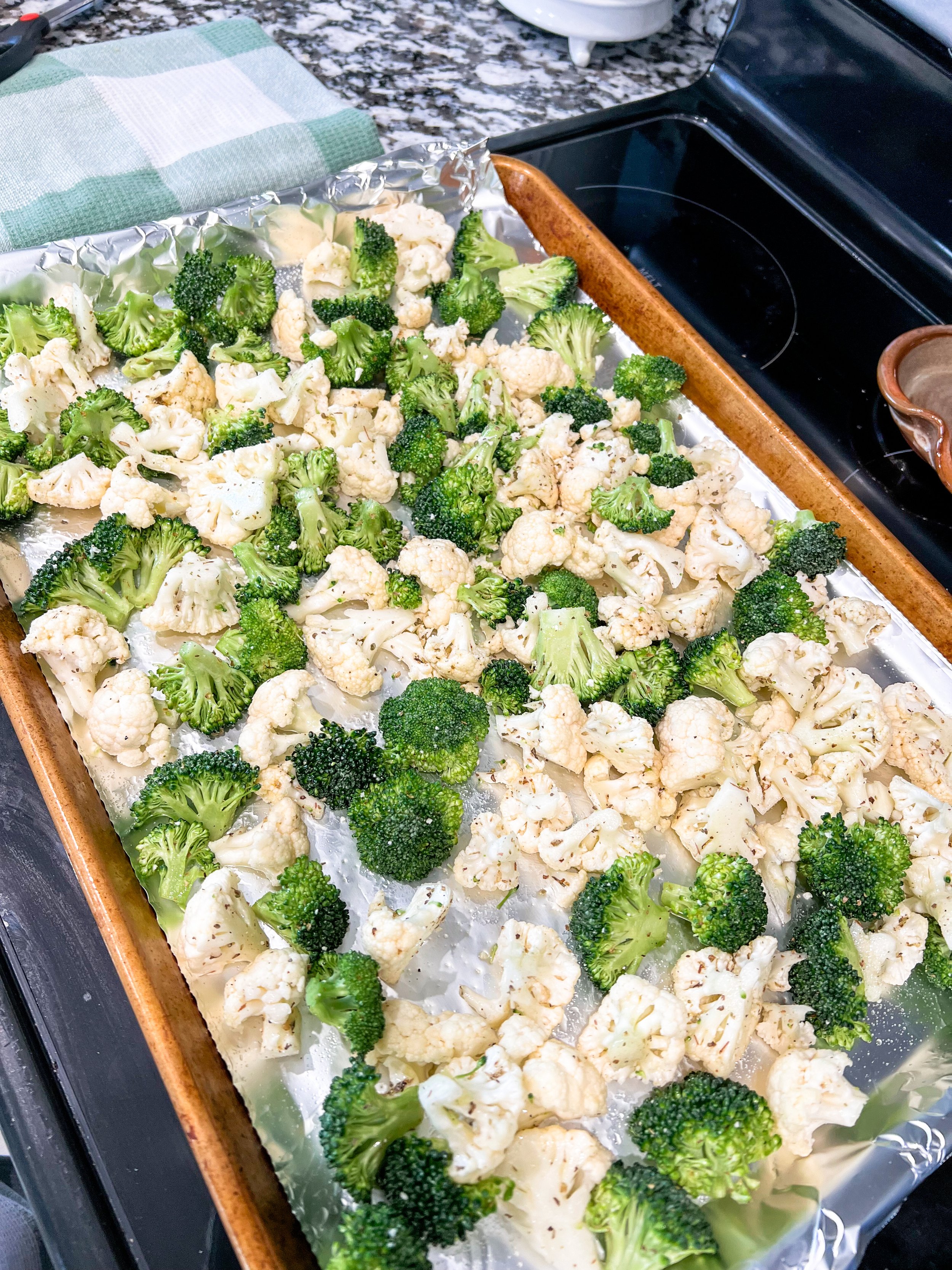 Chop cauliflower and broccoli into medium size pieces. Drizzle with 2 tbsp olive oil, sprinkle with salt, pepper, onion powder, dried marjoram. Toss to coat. Spray baking sheet with olive oil spray and spread vegetables across the sheet.