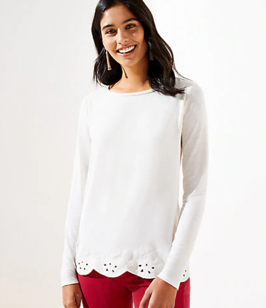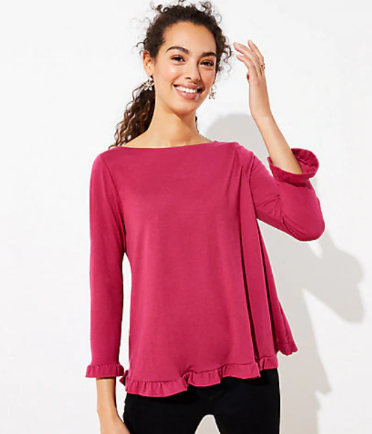 Okay, so this might be more of a fall shirt, I’m not sure, I bought it on Final Sale because it was under $10?! Too good to pass up. It is ADORABLE! I love the little feminine detail in the ruffles and it’s pretty lightweight. The boatneck is chic and it’s technically 3/4 sleeves but I’m short so the sleeves are a bit longer on me. (I’m 5’1) It’s color is called Sweet Cranberry and it is just that - so sweet!! It if final sale right now 50% off $12.88 with code LOVEIT. Click the image to shop this top!